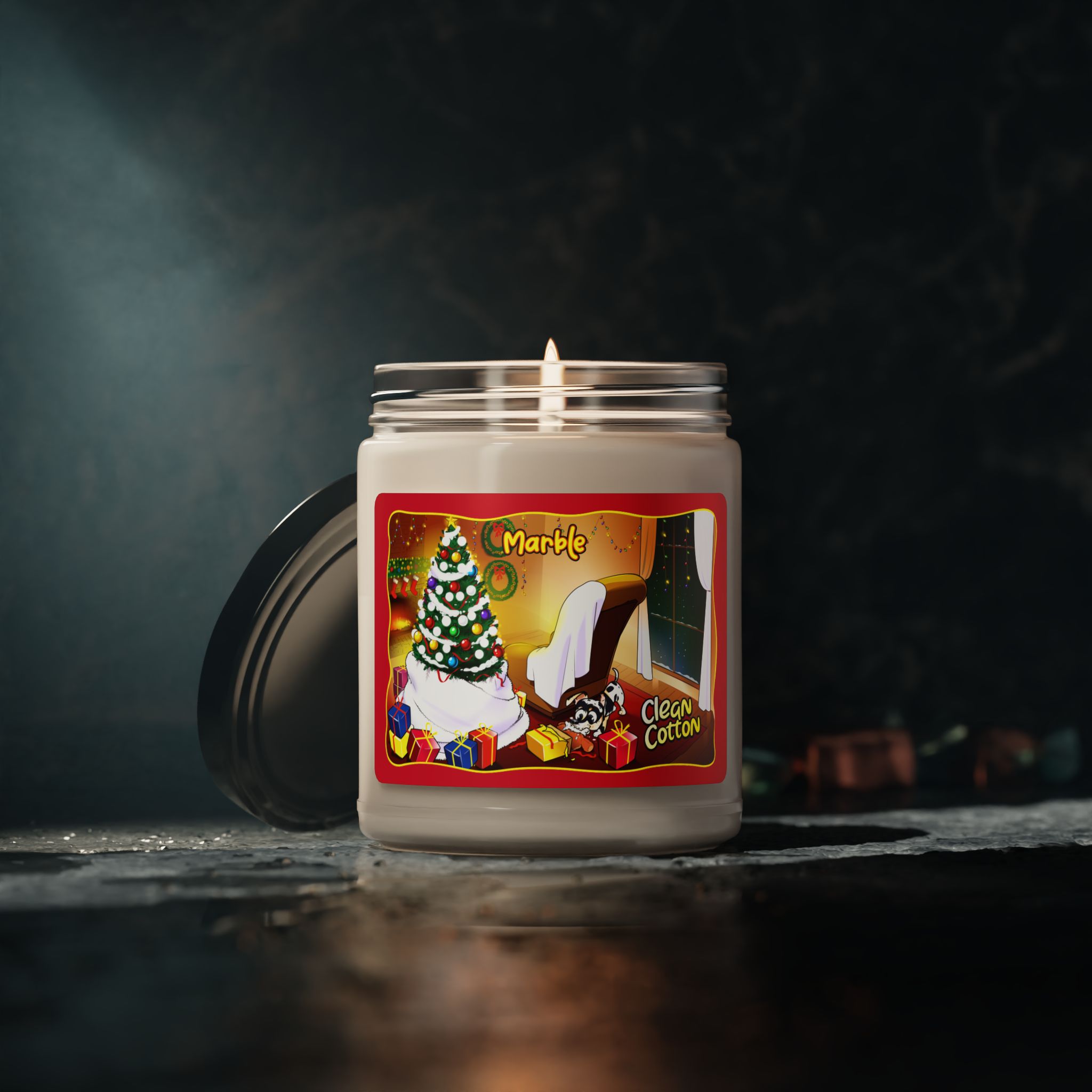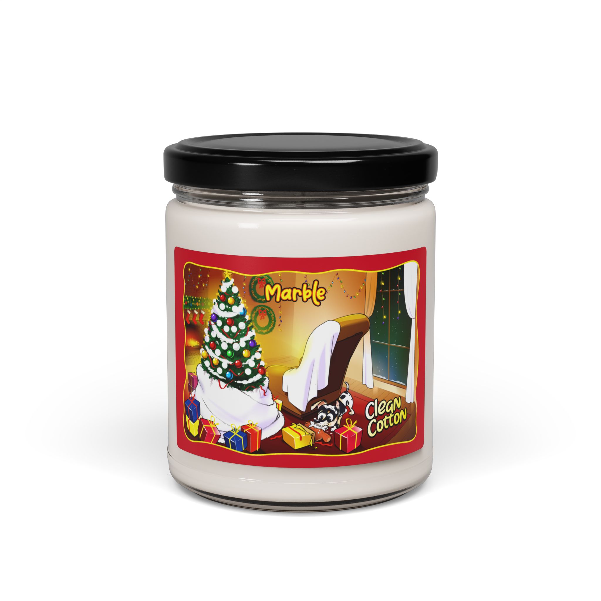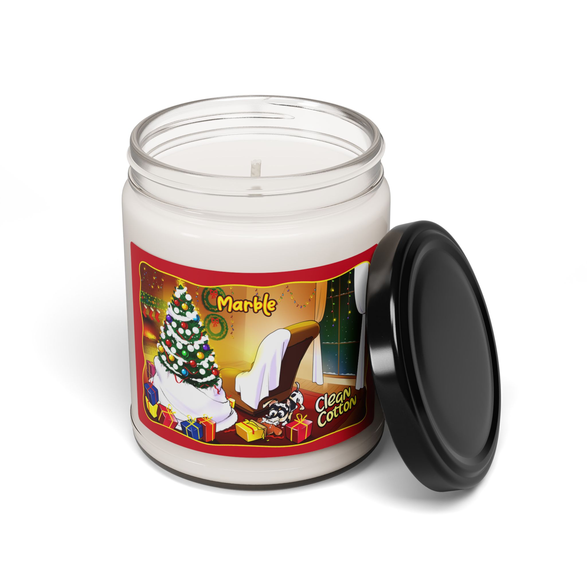 Feel the holiday spirit in your cozy Christmas living room by lighting this wonderfully crafted candle. The candle’s design features a cozy Christmas living room aglow with twinkling lights and the warmth of holiday cheer. Admidst stockings and tinsel, Marble is busy being adorably naughty, turning his teddy into a flurry of soft stuffing – a scene that embodies the playful spirit of Christmas mornings.